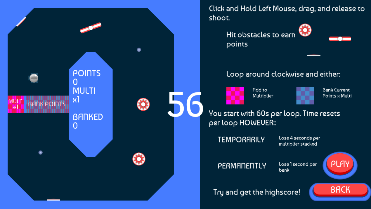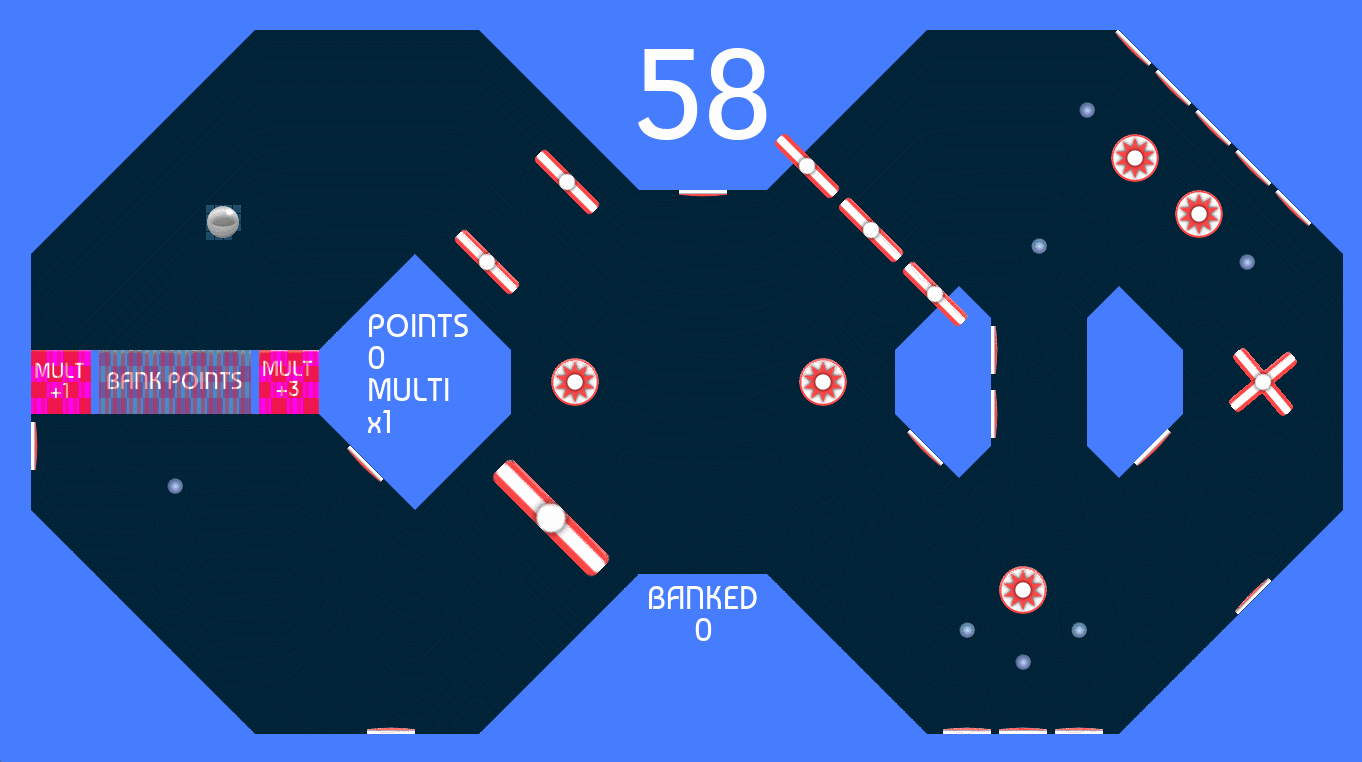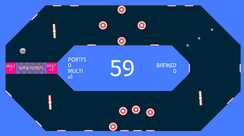 Shoot your Pinball around the track! Hit obstacles! Get points! Bank those points... or risk adding multipliers first. Don't run out of time!